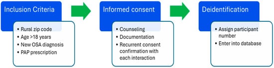 Currently, our practice operates a rural clinic, an urban clinic, and credentialed sleep centers at both sites. An industry standard for definition of compliance with PAP therapy is using the PAP machine for at least four hours per night, for one thirty-day period, during a ninety-day compliance window. Many insurers require PAP usage to be monitored during the first ninety days of therapy or after receiving a new machine. The no-show rate for visits and failed compliance for patients living in rural areas is substantially higher than that of patients living in urban areas at both practice sites (internal quality assurance program findings, 18 January 2023). Multiple barriers to care contribute to this problem, including lack or cost of transportation, educational background, perceived need for treatment, and most importantly, decreased access to healthcare including specialty services. We initiated a sleep medicine telehealth support program in our practice during the COVID pandemic and we continue to offer these telehealth services since they were so well received by patients, especially those living in rural areas.