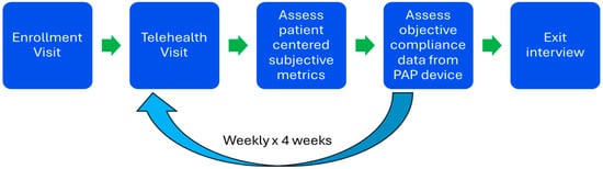 Figure 2). The investigator contacted the participants for the weekly telehealth visits via the telehealth system utilized by the clinic for standard telehealth visits. This system utilizes the Doximity platform, which is a secure HIPAA-compliant telehealth system. Each telehealth visit lasted an average of 10 min. The topics covered in each visit included system use, PAP tolerance, problems encountered, methodologies for addressing any problems, and the questionnaires and Likert scales as described. The exit interview questionnaire, final ESS score, and final PAP compliance percentage completed data collection. The PI performed the telehealth visits and recorded the data on an Excel spreadsheet, which was protected and stored securely in the practice site EHR and secure server.