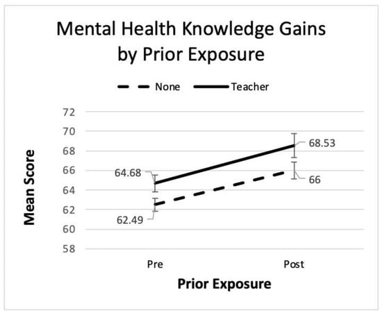 The current research is one of the first to demonstrate pre-score differences for those with prior exposure supporting Hypothesis 6. However, Hypothesis 7 was not supported. Unexpectedly, and contrary to Hypothesis 7, there was no significant interaction for prior exposure; students with prior exposure gained similarly to those without. This suggests that mental health educational programming may be beneficial to students who are already receiving this information in the school curriculum. One might postulate that repeated messaging, messaging from multiple sources, and messaging at different points in time are crucial in enhancing mental health literacy in youth.