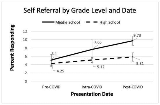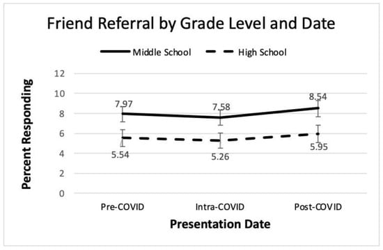 Figure 5 shows a slight dip and then an increase in help-seeking for a friend over time, but these differences did not achieve statistical significance. These findings provide some agreement with research by Stelzmann et al. that failed to find increases in youth help-seeking during COVID-19 [