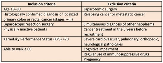 The inclusion criteria encompassed the following conditions: an age range of 18 to 80 years; a histologically confirmed diagnosis of localized primary colon or rectal cancer (stages I–III) treated with laparoscopic resection surgery; a physically inactive lifestyle (defined as engaging in less than 150 min of physical activity per week); a Karnofsky Performance Status (KPS) score above 70; and the ability to walk at least 60 m. The Karnofsky Performance Status is a widely used and validated scale for assessing the functional status of the cancer patient. A KPS ≤ 70 indicates significant impairment in performing daily activities and self-care, along with an inability to work [19].