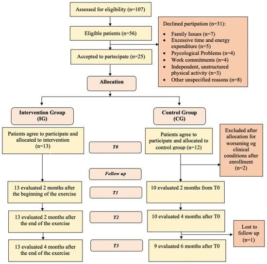 During the initial assessment, detailed explanations regarding the study were provided, and the inclusion and exclusion criteria were carefully evaluated. Patients who declined participation were asked to specify their reason, and their responses were documented. Eligible individuals who agreed to enroll provided written informed consent. A surgical evaluation was performed in conjunction with the first post-surgical follow-up visit, approximately ten days after the surgery, to determine suitability for physical activity. Subsequently, a cardiological screening was conducted by a Sports Medicine Specialist at “Foro Italico” University of Rome, Italy, to confirm eligibility for a physical exercise program. The participant flow throughout the study is illustrated in Figure 2. Patients included in the study were consecutively allocated to the IG (supervised home-based exercise program) and the CG (standard of care), following a non-randomized study design. Outcome measures were assessed before the start of the rehabilitation program (T0), at 2 months from the start of exercise (coinciding with the end of the treatment) (T1), and at 2 (T2) and 4 (T3) months after the end of the treatment. The assessments at T0, T1, T2, and T3 were conducted by the same specialist in Physical and Rehabilitation Medicine.