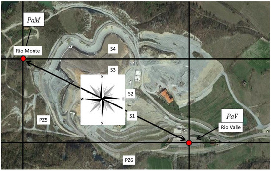 Figure 1. Plan and top view of the monitored site. S1–S4—sampling sites inside the landfill; PZ5–6—sampling sites outside the landfill. PaM—upstream area above the landfill (Rio Monte); PaV—down-stream area below the landfill (Rio Valle).