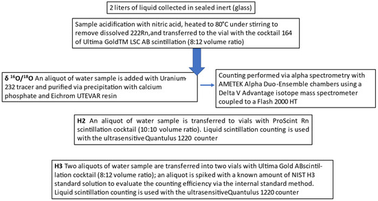 Two radioisotopes (2H, 3H) and the 16O/18O ratio were analyzed via alpha/beta liquid scintillation in the collected water samples and isotope ratio mass spectrometry (IRMS), respectively. The analysis of radioisotopes was performed according to ISO 11704 and ISO 17025 standards [19,20]. An aliquot of water sample was acidified with nitric acid, heated to 80 °C under stirring to remove dissolved 222Rn, and transferred to a vial with the cocktail of Ultima GoldTM LSC AB scintillation (8:12 volume ratio) (MERCK, Darmstadt, Germany). Liquid scintillation counting was performed using the ultra-sensitive Quantulus 1220 counter (PerkinElmer, Waltham, MA, USA) with calibration parameters and alpha/beta discrimination optimized with ECKERT&ZIEGLER 90Sr and NIST 241Am reference materials. The procedure used for the analysis of each isotope is as follows: