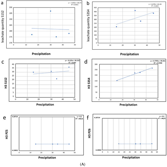 (A) Linear regression analyses of the correlation between rain precipitation (x axes) and radioisotope amounts (y axes) in sampling points inside the landfill, either inert (a,c) or still in use (b,d); sampling points outside the landfill (e,f). Significant correlations between rain precipitation and radioisotope amounts in leachate were detected only in active sites inside the landfill. (B) Linear regression analyses of the correlation between waste contribution (x axes) and radioisotope (y axes) in sampling points in active sites inside the landfill (a,b); sampling points outside the landfill (c,d). Significant correlations were detected only in active sites inside the landfill.