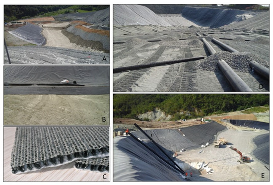 Best available intervention technologies utilized at the La Filippa landfill to mitigate environmental impact. (A,B) impermeabilization; (C) draining geonet, (D,E) infrastructures for leachate collection, purification, and outflow.