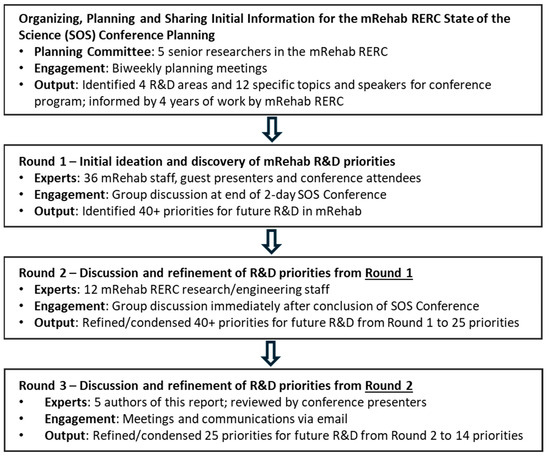 - Round 1. The initial round of broad discovery of R&D needs and opportunities for mobile rehabilitation was conducted via an interactive ideation session among all staff, speakers and attendees (approximately 36 rehabilitation R&D professionals) in a two-hour session at the end of the SOS Conference. Participants were asked to identify a list of key priorities for the field, informed by the 12 presentations and discussions and by the participants’ own knowledge and experience as researchers, engineers, clinicians and administrators.