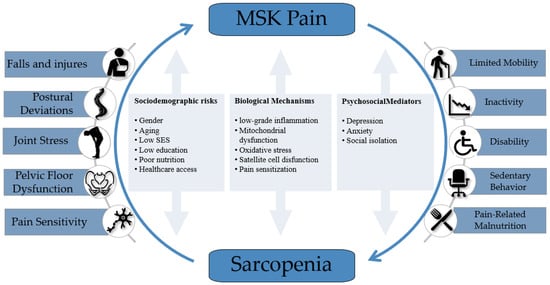 Apart from these cyclical interactions, sarcopenia and MSK pain also share several sociodemographic risk factors. Building upon the previously mentioned determinants, both conditions appear to be influenced by factors such as female sex, low socioeconomic status (SES), and low educational level, highlighting the broader social and environmental contexts in which these conditions occur [5,7,89].