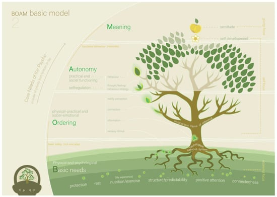 Model 2 shows a tree that represents the human psyche and is based on the Pyramid of Maslow. It explains that the human psyche is constantly focused on the fulfilment of four core psychological needs (in hierarchical order: basic needs, order, autonomy, and meaning), of which the starting letters form the acronym BOAM. The basic needs of the psyche (represented by the soil the tree grows in) are protection, rest, nutrition/exercise, structure/predictability, positive attention and connectedness, all of which need to be fulfilled both physically and psychologically to be able to function well. If the basic needs are fulfilled, the next need to be fulfilled is the need for ordering. Ordering is the neuropsychological process by which the continuous flow of sensory stimuli is converted into a perception of reality. This is performed quickly and unconsciously by using the unconscious frame of reference about the self, others, the world and life, which is built up over a lifetime (depicted by the tree trunk and branches). The frame of reference contains not only core beliefs and cultural values but also foundational knowledge about practical and social structures. Because the frame of reference largely determines the perception of reality, it also determines the thoughts and feelings that are a reaction to that perception and thus cause the behaviour. This behaviour influences the new experiential knowledge that is collected, and in this way, this frame of reference is further refined. The more comprehensive the frame of reference is, the faster and better the ordering processes can take place, and new experiences can be understood. When the need for ordering is fulfilled, basic security can be experienced, and the subsequent need for autonomy (depicted by the leaves) arises. Only when the (imperceptible) ordering goes well enough (meaning the perception of reality sufficiently matches (other‘s) reality) can behavioural strategies emerge that lead to (perceptible) autonomy. The core need for autonomy is fulfilled by self-regulating behaviour, such as executive functioning and social abilities, which allow self-organisation of basic needs in practical and social circumstances. After fulfilment of the need for autonomy, the need for meaning arises, which consists of different forms of self-development (depicted by blossom) and, in the case of adults, servitude (depicted by fruits or nuts).