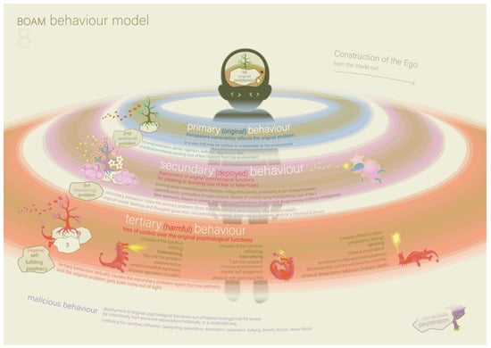 The BOAM Behaviour Model shows how one’s own behaviour can cause more problems, keeping the original disturbance out of sight and unsolved. There are four forms of human behaviour: original, deployed, harmful and malicious behaviour. The latter does not occur in every human being, but the first three do. In the model, these forms of behaviour are represented by three coloured ‘behaviour circles’ that build up around the human figure, from the inside out and in response to disturbances to ‘survive’ these. The model starts with the primary problem, namely overstimulation, neglect, trauma and/or indirect trauma. Primary behaviour: a child responds to the primary disturbance by natural behaviour that transparently reflects this primary problem. The child signals to the parent that a basic need or the need for ordering is under pressure, which prevents it from experiencing basic safety. Secondary problem: the primary behaviour may be misunderstood or unwanted and causes a dysfunctional or negative reaction in the parents, such as misunderstanding, denial, rejection, fear or aggression. These reactions cause attachment ruptures (that every person suffers to some degree), resulting in a decreased trust within the child that the parents can and will fulfil the basic needs or need for ordering. Spoiling is also a problematic reaction of the parents to the expressed needs of their child. This reaction does not cause attachment ruptures but instead creates dependency and unrealistic self-confidence as the secondary problem. Secondary behaviour: the child will try to behave in a way that parents do understand, expect or desire out of fear or false hope. The child deploys (‘misuses’) self-regulation to deny the authentic needs, feelings, trauma or inability, and instead forces deployed behaviour, such as pleasing, lying, parentification, pretending, etc. Tertiary problem: The consequence of secondary behaviour is that it hides the primary problem, and, at some point, self-regulation will run out. Tertiary behaviour: During the secondary behaviour, the initial needs, thoughts and feelings were being transformed into uncontrollable desires, fixations and emotions. This causes uncontrolled behaviour, which is represented by three dragons that depict externalising behaviour, internalising behaviour and ignoring behaviour (e.g., dissociation or addiction). This behaviour logically induces negative reactions (such as misunderstanding, rejection, aggression or even more spoiling) from the environment, thus repeating the secondary problem, but this time ‘justified’ because of the extreme behaviour. This is called a self-fulfilling prophecy and leads to a vicious circle while the primary problem has gone out of sight. If mental health care is sought, it may be that the focus will be only on the tertiary (and sometimes secondary) behavioural patterns and symptoms, which will never really be resolved for the long term until the primary problem is recognised, acknowledged and addressed.