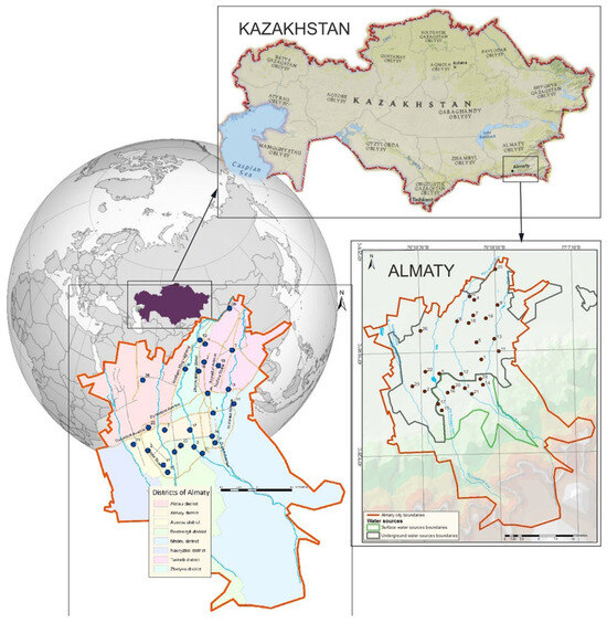 Almaty is located in the center of the Eurasian continent, in the southeast of the Republic of Kazakhstan (Figure 1). Its geographical coordinates are delineated as 77° E longitude and 43° N latitude. Almaty is nestled within the aesthetically pleasing foothills of the Zailiysky Alatau, which represents the northernmost segment of the Tien Shan mountain range. The city encompasses an expanse exceeding 170 square kilometers and is located within the valley formed by the Bolshaya and Malaya Almatinka rivers alongside their respective tributaries, all of which emanate from the glaciers of the Zailiysky Alatau and adjacent mountain gorges. The primary sources of potable water for Almaty are derived from mountain rivers, lakes, and groundwater.
