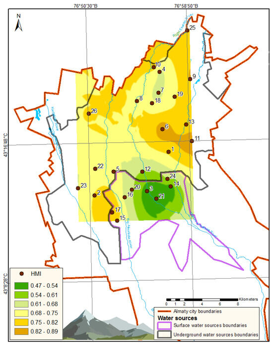 Using Equation (1), HMI was computed for each sampling point. The obtained HMI values are presented in the last column of Table 2. The spatial distribution of HMI throughout Almaty is visually illustrated in Figure 2.