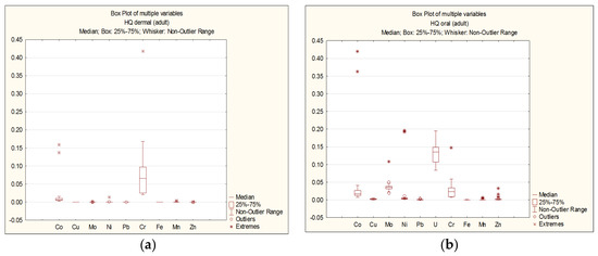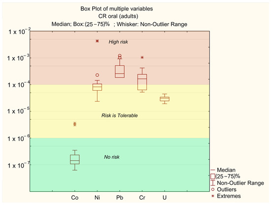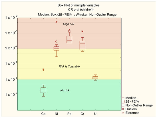 The individual hazard quotient (HQ) for each element must satisfy HQ < 1 [29,30,31,32,41]. Carcinogenic risk (CR) threshold value, according USEPA’s recommendations [29,30,31,32,42,43]: CR < 1 × 10−6—no risk; 1 × 10−6 < CR < 1 × 10−4—risk is tolerable; CR > 1 × 10−4—high risk.