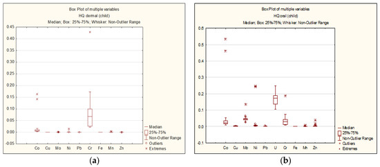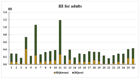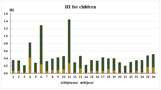 USEPA’s suggested non-carcinogenic risk (HI) threshold value for HI is 1 [29,30,31,32,41]: 1 < HI ≤ 5—low risk; 5 < HI ≤ 10—moderate risk; HI > 10—high risk [32,41].