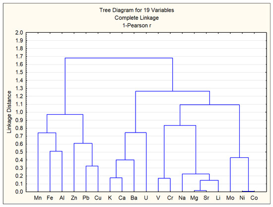 Based on the data from Table 4, a cluster analysis of chemical elements was conducted, and the results are shown in Figure 9. The vertical scale in Figure 9 represents the distance, calculated as 1 − r, meaning that the smaller the distance between the analyzed elements, the stronger their correlation.