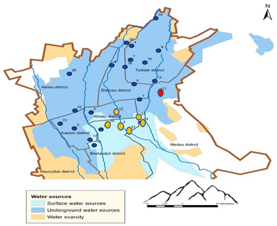 For the purpose of analyzing elemental composition, a total of 26 sampling points for drinking water were systematically selected from various locations throughout Almaty (Figure 1). The figure additionally illustrates the regions associated with both groundwater and riverine sources of drinking water.