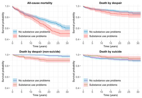 Table 2 displays the distribution of demographic and diagnostic variables in the total sample and their association with all-cause mortality. Men had a significantly higher risk of death compared to women, with nearly double the adjusted hazard. Among diagnostic categories, substance use problems were significantly associated with an increased mortality risk, while other disorders, such as adjustment disorder, dysthymia, and psychosis, did not show statistically significant associations in the adjusted models. The survival curves of individuals with and without substance use problems are shown in Figure 1.