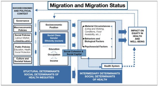 The experience of migration and migration status are key social determinants of health and well-being, as they place individuals in circumstances that can significantly affect their health [11,12]. The conditions surrounding migration and its health impacts are shaped by a range of factors that differ across migrant groups and legal statuses [13,14,15]. The social determinants of health (SDH) framework, highlights the critical role of social, economic, and political factors, along with structural mechanisms, in influencing individual health behaviors and risks (Figure 1) [16].