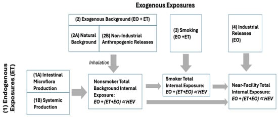 - Endogenous Exposures: Internal exposure to EO that results from the production of ET by two general pathways, which is then metabolized to EO within the body (as summarized by Kirman et al. [1]): Pathway 1A: Production of ET by intestinal microflora; and Pathway 1B: Systemic production of ET (primarily hepatic). A small fraction of ET from both pathways is converted to EO within the body.
