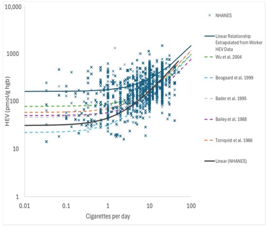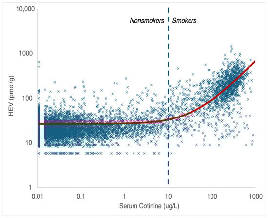 - HEVTns = Total HEV biomarker burden in nonsmokers (pmol/g hemoglobin);