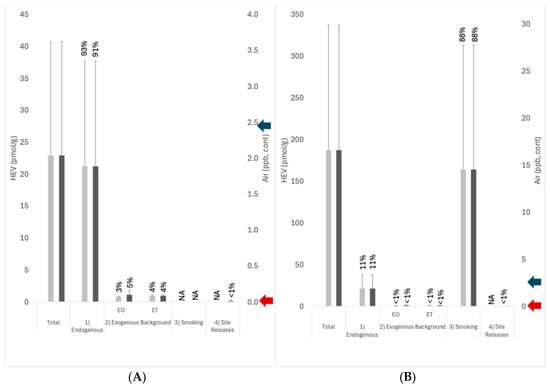 - Lack of Direct Endogenous EO Measurements—Direct measurements of endogenous EO levels are not required to quantify this pathway. Direct measurements are available for endogenous ET from closed-chamber studies of human volunteers [54,55], whose data were considered in the PBPK model developed for EO [20] and for which EO production from ET metabolism is consistent with toxicokinetic principles and model predictions (Figure 3). Hemoglobin biomarkers such as HEV serve as much better biomarkers of EO exposure than direct blood EO measurements, since they are cumulative biomarkers that reflect integrated exposures over several months prior to measurement, making them the biomarker of choice of EO for health agencies (e.g., CDC, DFG). More importantly, direct measurements for exogenous EO (USEPA’s air monitoring data) and for exogenous ET (Health Canada air monitoring data) account for only a fraction of the direct measurements made for total exposures to EO (CDC’s HEV data). Therefore, the indirect estimates of endogenous production based upon the difference between these two direct measurements of air monitoring and CDC’s total exposures remain scientifically sound.