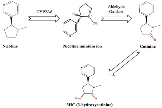 Cotinine and 3HC (3-hydroxycotinine) are formed when nicotine is oxidized by the enzyme cytochrome P450 2A6 in the human liver [17]. This enzyme converts nicotine into a nicotine iminium ion, which is then acted upon by aldehyde oxidase, ultimately producing these metabolites as shown in Figure 1 [17].