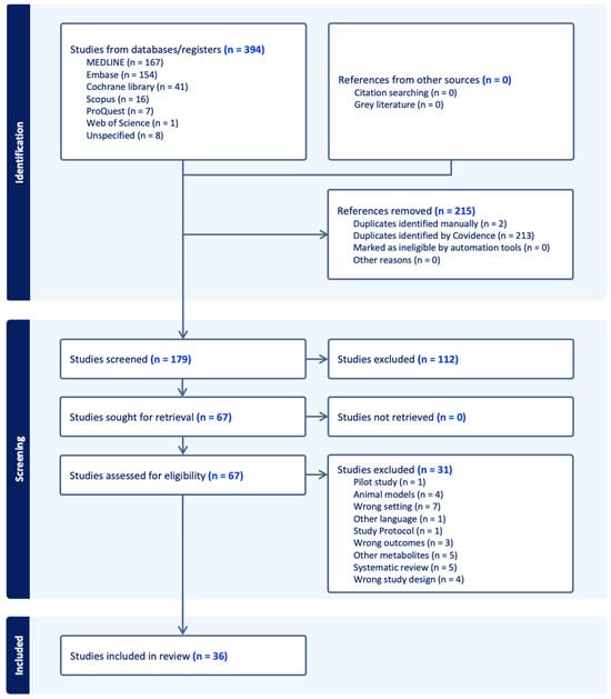 The PRISMA flow diagram is presented in Figure 2, representing the literature search retrieval process and the number of studies identified at each stage of the review process. From the total number of 394 studies from selected databases, 215 studies were removed and excluded. After screening the title and abstract for eligibility, 179 studies remained, of which 112 irrelevant studies were identified and excluded. A total of 67 studies were retrieved for full-text review, and 31 studies were excluded due to different reasons such as wrong setting, pilot study, wrong outcomes or animal models in this study. Thirty-six studies were eligible to be included in this systematic review and data extraction.