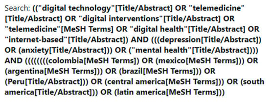 | ((“digital technology”[Title/Abstract] OR “telemedicine”[Title/Abstract] OR “digital interventions”[Title/Abstract] OR “telemedicine”[MeSH Terms] OR “digital health”[Title/Abstract] OR “internet-based”[Title/Abstract]) AND (((depression[Title/Abstract]) OR (anxiety[Title/Abstract])) OR (“mental health”[Title/Abstract]))) AND ((((((((colombia[MeSH Terms]) OR (mexico[MeSH Terms])) OR (argentina[MeSH Terms])) OR (brazil[MeSH Terms])) OR (Peru[Title/Abstract])) OR (central america[MeSH Terms])) OR (south america[Title/Abstract])) OR (latin america[MeSH Terms])) | ((“Tecnología”[Title/Abstract] OR “telemedicina”[Title/Abstract] OR “digital”[Title/Abstract] OR “telemedicina”[MeSH Terms] OR “digital”[Title/Abstract] OR “internet”[Title/Abstract]) AND (((depresión[Title/Abstract]) OR (ansiedad[Title/Abstract])) OR (“salud mental”[Title/Abstract]))) AND ((((((((colombia[MeSH Terms]) OR (méxico[MeSH Terms])) OR (argentina[MeSH Terms])) OR (brasil[MeSH Terms])) OR (Perú[Title/Abstract])) OR (centroamérica[MeSH Terms])) OR (sudamérica[Title/Abstract])) OR (latinoamérica[MeSH Terms])) | ((“tecnologia digital” OR “telemedicina” OR “intervenções digitais” OR “telessaúde” OR “saúde digital” OR “internet” OR “saúde mental digital”) AND (“saúde mental” OR “depressão” OR “ansiedade”)) AND (“Colômbia” OR “México” OR “Brasil” OR “Argentina” OR “Peru” OR “América do Sul” OR “América Central” OR “América Latina”) |