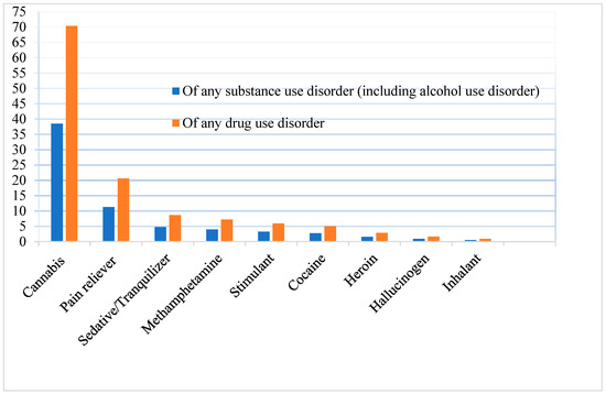 Table 1 shows that in 2022 and 2023, 18.1% of USA adults (or 46.4 million people), without any significant difference between 2022 and 2023 (F[1, 50] = 0.33, p = 0.566), had any past-year SUD. Of those with any SUD, 16.1% had both AUD and DUD, 45.3% had AUD only, and 38.6% had DUD only—i.e., 61.4% had AUD and 54.7% had DUD—again without any significant difference between 2022 and 2023 (F[1.95, 97.50] = 1.23, p = 0.296). Figure 1 shows specific DUDs, with cannabis use disorder being the most prevalent, followed by prescription opioid/pain reliever disorder.