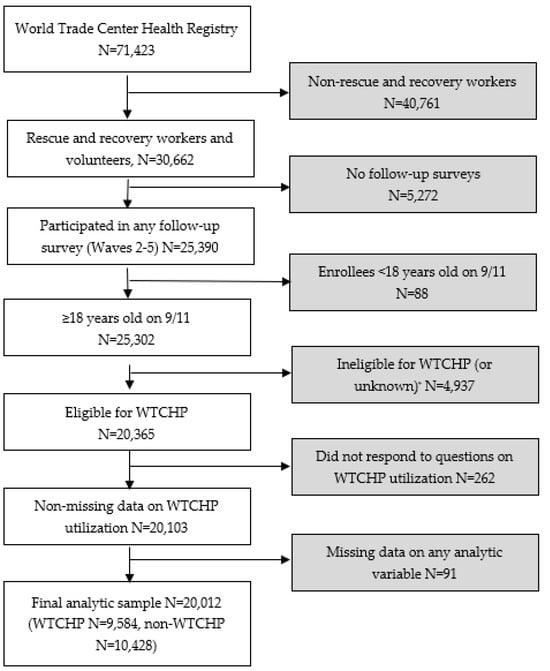 The WTC Health Registry cohort consists of 43% WTC rescue, recovery, and cleanup workers and volunteers (hereafter referred to as RRWs) and 57% survivors who were not involved in WTC rescue and recovery effort, with a total of over 71,000 enrollees responding to the Wave 1 survey in 2003–2004 (Baseline survey, Wave 1) []. After recruitment, four follow-up surveys have been conducted in 2006–2007 (Wave 2), 2011–2012 (Wave 3), 2015–2016 (Wave 4), and 2020–2021 (Wave 5), respectively [,]. For this study, we focused on RRWs in the WTC Health Registry who were eligible for enrollment into WTCHP. As shown in Figure 1, we first restricted the analytic sample of RRWs (N = 30,662) to those who participated in any follow-up survey Waves 2–5 (N = 25,390) since survey questions on WTCHP utilization were asked in each of these wave surveys. We then excluded RRWs who were less than 18 years old on 9/11 due to small numbers in this age group (N = 88), who were ineligible for WTCHP (or unknown eligibility) based on available data on date and hours of rescue and recovery work required by NIOSH for eligibility [] (N = 4937), or who did not respond to questions on WTCHP utilization in any of the Waves 2–5 follow-up surveys (N = 262). Using Wave 1 survey data, we compared demographic characteristics between enrollees included in the study and those excluded and found no clinically meaningful differences between the two groups. Therefore, we performed a complete case analysis, which resulted in 91 more exclusions due to missing data on any analytic variable. This process resulted in a final analytic sample of 20,012 RRWs (64.9% of total number of RRWs enrolled in the WTC Health Registry).