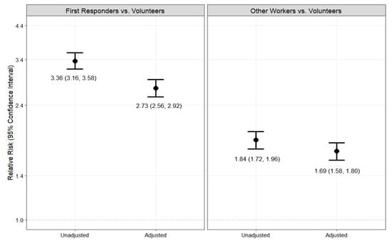 Unadjusted and adjusted relative risks and 95% confidence intervals for the association of worker type with WTCHP utilization in the World Trade Center Health Registry, N = 20,012. Legend: Adjusted relative risks and 95% confidence intervals are adjusted for age on 9/11, sex, race, ethnicity, education, NYC residency, comorbidities, and type of WTC Health Registry enrollment. First responders include rescue/recovery workers who were affiliated with Fire Department of New York City or New York City Police Department. Abbreviations: WTCHP: World Trade Center Health Program.