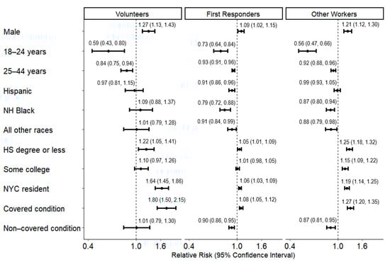 Adjusted relative risks and 95% confidence intervals for the associations of sociodemographic characteristics and medical conditions with World Trade Center Health Program utilization by worker type, World Trade Center Health Registry, N = 20,012. Legend: Relative risks and 95% confidence intervals are adjusted for the other variables in the figure and type of WTC Health Registry enrollment. Refer to Table 1 to identify the reference category for each variable (e.g., ≥45 years is the reference category for age on 9/11). First responders include rescue/recovery workers who were affiliated with Fire Department of New York City or New York City Police Department. Covered condition includes at least one reported diagnosis of anxiety, asbestosis, asthma, chronic bronchitis, chronic obstructive pulmonary disease, chronic sinusitis, depression, emphysema, gastroesophageal reflux disease, post-traumatic stress disorder, pulmonary fibrosis, reactive airway disease, or substance use disorder, which are all covered by World Trade Center Health Program. Uncovered conditions include at least one reported diagnosis of angina, coronary artery disease, diabetes, hypertension, other heart conditions, myocardial infarction, and stroke, which are all conditions not covered by WTCHP after classifying those with a covered condition. Abbreviations: HS = high school; WTCHP = World Trade Center Health Program; NH = non-Hispanic.