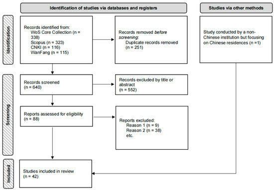 The inclusion criteria for full-text assessment were as follows: (1) research that clearly identified noise annoyance as a core indicator and used standardized scales; (2) research that explicitly examined the relationship between non-acoustic factors and noise annoyance and provided a statistical analysis. After a rigorous screening process, 47 articles that failed to meet the inclusion criteria were excluded, leaving 41 qualified studies. In addition, one relevant study conducted by a non-Chinese institution but focusing on Chinese residents was included, resulting in a final total of 42 studies for analysis.