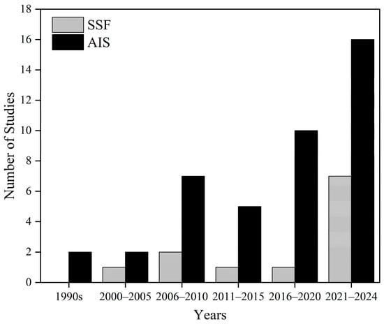 Yearly distribution of included studies. Note: SSF refers to studies specifically focusing on the impact of non-acoustic factors on noise annoyance, and AIS refers to all included studies.