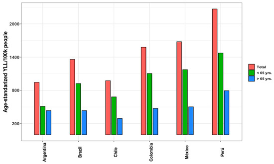 Based on the data provided in these reports, we estimated age-standardized YLL for the six Latin American countries stratified by age group (Figure 2). For more details, see Tables S4–S9 in the Supplemental Material. The age-standardized YLL per 100,000 persons ranged from 945 in Argentina to 2268 in Peru. Younger patients (<65 years) contributed more to YLL rates than adults aged >65 years.