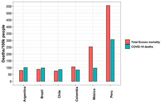 All age ranges of total excess mortality and COVID-19 deaths per 100,000 persons in six Latin American countries in 2020. Source: author’s elaboration based on the literature review.
