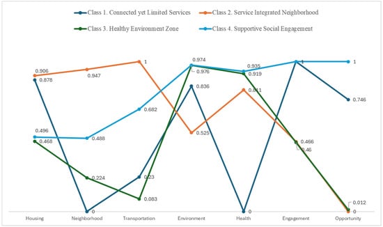 Figure 1 presents the identified neighborhood types. Class 1, which comprised 15% of the sample, was designated as “Connected yet Limited Services”. This class is characterized by neighborhoods with strong housing, natural environments, social engagement, and opportunities, but limited neighborhood infrastructure, transportation, and health services. Class 2, labeled as “Service-Integrated Neighborhood” (28%), includes areas with a well-developed built environment—encompassing housing, neighborhood, and transportation—and health services, though the natural environment and social engagement are comparatively weak. Class 3, termed the “Healthy Environment Zone” (24%), describes neighborhoods with a high-quality natural environment and robust health services but limited built and social environments. Finally, we labeled Class 4, the largest group (33%), as “Supportive Social Engagement”. This class is characterized by neighborhoods with a quality natural environment, health services, and strong social engagement, but a limited built environment.