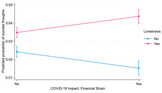 Figure 1. Predicted probability of suicidal ideation by COVID-19-related financial strain and loneliness/emotional distress.