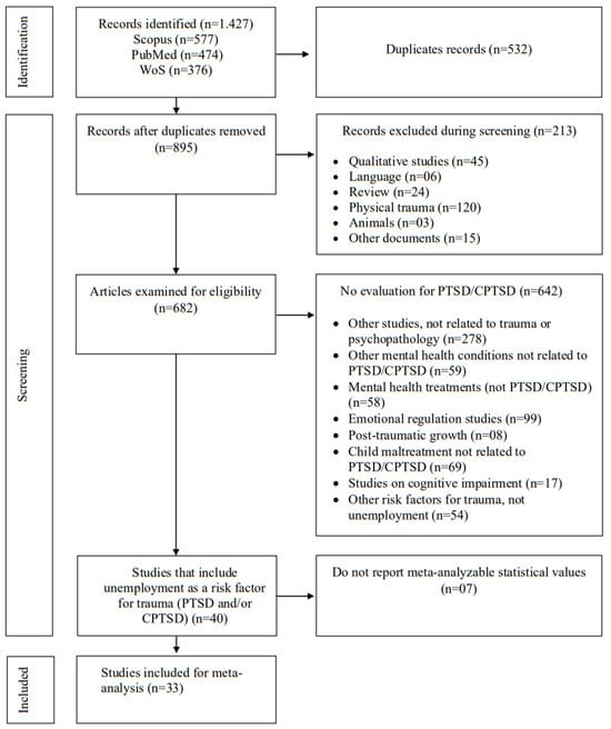 Studies were excluded if they addressed physical traumas (specifically musculoskeletal and/or neurological pathologies) and not PTSD and/or CPTSD; if they did not present meta-analyzable data (OR or frequencies); or if they contained insufficient data to calculate univariate effect sizes and it was not possible to obtain such information from the study’s author. Likewise, any studies that did not include unemployment as a risk factor or examined unemployment experienced by someone other than the study sample (e.g., a relative) were excluded, as were reviews or qualitative studies that did not present new data or only included qualitative analyses. Further exclusions involved single-case designs. Finally, if more than one article presented data from the same sample, the most recent and comprehensive article was included in the meta-analysis.
