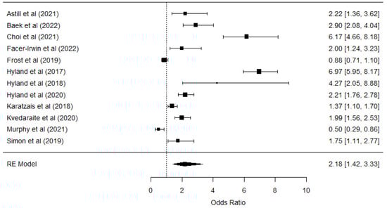 Forest plot of the unemployment and CPTSD relationship [,,,,,,,,,,,].