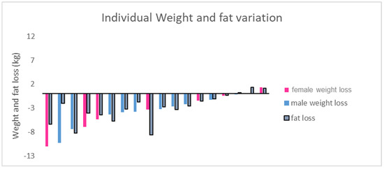 The 6-month walking program resulted in significant reductions in body weight (−3.8 ± 3.4 kg, p < 0.001), BMI (−1.4 ± 1.3 kg/m2, p < 0.001), and WC (−5.6 ± 4.7 cm, p < 0.001). Fat mass decreased significantly (−3.0 ± 2.9 kg, p < 0.01), while lean body mass remained stable, indicating that weight loss was primarily due to fat loss (Table 1). Despite inter-individual variability (Figure 1), five of the eighteen participants (three women, two men) achieved clinically significant weight loss (≥5%), and four men ended the training session with a non-obese status (FM% below 25).
