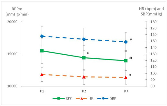 Resting Cardiovascular Measures: Resting SBP decreased from 131 ± 14 mmHg at baseline to 123 ± 14 mmHg after 6 months (p = 0.012), while DBP decreased from 100 ± 10 mmHg to 95 ± 6 mmHg (p = 0.014) (Table 2). Resting HR showed a non-significant reduction overall (77 ± 13 bpm to 73 ± 11 bpm, p = 0.09), but significantly decreased in female participants (p = 0.007). Meanwhile the resting RPP decreased significantly and the decrease attained significant level at D3 compared with D1 (p = 0.004); six subjects thus showed resting RPP > 10 000 mmHg·min−1 after training compared to eight at the first visit. This reduction in resting RPP suggested a lower myocardial oxygen demand following training.
