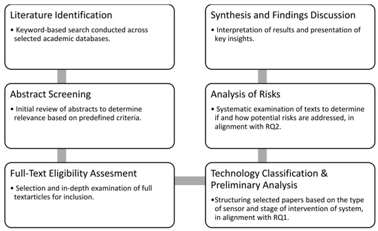 In this study, we employ a systematic approach by gathering and analyzing research papers on applications of AI-based systems which are designed to enhance occupational safety. We focus on systems that are built around the human operator and follow a human-centered design, i.e., they are developed with an emphasis on user interaction and address human needs and experiences [12]. Specifically, we are interested in applications where the human operator is either (i) assisted by the system, where the system provides safety-relevant information (e.g., safety wearables worn on the body) or (ii) monitored by the system (e.g., computer vision technologies monitoring safety compliance at a shop floor). Generally, these systems are frequently composed of a similar set of components, which frequently include, but are not limited to, e.g., a power unit, a sensor unit, a controller unit, a connection unit, a storage unit, and a type of user interface. While these components might simply describe a computer, this is important to mention here, since we focus our discussion largely on the sensor unit. The research logic is demonstrated in Figure 1.