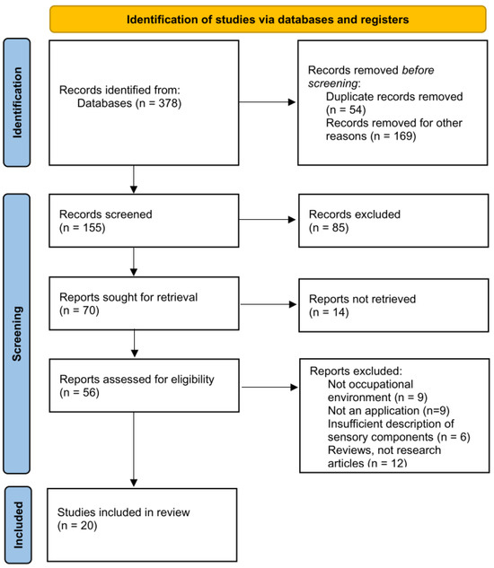 Using Google Scholar, IEEE Xplore, and ACM Digital Library, we focused on papers published from 2022 onward, with the rationale detailed in the Related Research section. The keywords used included “occupational safety”, “artificial intelligence”, “wearable systems”, “smart personal protective equipment (PPE)”, “cognitive systems”, “safety recognition”, “industry”, and combinations of these terms. From the initial search, 155 abstracts were selected and reviewed, resulting in a full-text examination of 56 papers. Out of these, 20 publications were included in the study. Papers were excluded if they were duplicates, inaccessible, did not meet the inclusion criteria, or were not research articles (for details, see Figure 2).