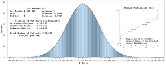 A total of 1,000,000 trials, repeated for each sample of 900,000 patients (300,000 per arm), were drawn from a multinomial distribution using the cell probabilities given in Example 1 (with T0 denoting the common referent-control group). A standardized value was computed for each simulated observation for by subtracting from this estimate and dividing it by . Plotting these values as a histogram yields Figure 1. The corresponding statistics (mean = 0, standard deviation = 1, and approximate zero values for skewness and kurtosis) indicate that the z-scores follow a standard normal distribution, as visually confirmed by the Normal (0,1) curve overlay. Furthermore, normality was not rejected by the Kolmogorov–Smirnov, Cramer–von Mises, or Anderson–Darling tests (see Appendix B for SAS code).