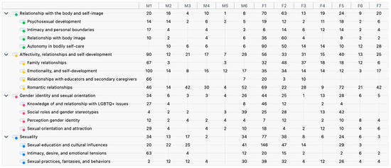 The identified themes include: (1) relationship with the body and self-image, which examines autonomy in self-care, body image perception, and respect for personal boundaries; (2) affectivity, relationships, and self-development, which explores the role of family, romantic, and educational relationships in shaping identity; (3) gender identity and sexual orientation, which focuses on awareness of one’s gender, social influences on gender roles, and the understanding of sexual orientation; (4) sexuality, which delves into sexual behaviors, intimacy, and sex education, exploring individual sexual dynamics and cultural and familial influences. The analysis places particular emphasis on the emotional and psychological aspects of sexuality, including experiences, fears, desires, and the role of sex education, as well as the influence of pornography and the media.