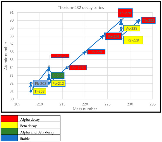 The half-life of a nuclide is the time required for half of the atoms of a particular radioisotope to decay into another isotope. A specific half-life is a characteristic property of each radioisotope. The half-lives of 235U and 238U are 710 million years and 4.5 billion years, respectively [6]. Key progenies of 238U include 226Ra (half-life of 1600 years) and 222Rn (half-life of 3.823 days) [6]. The half-life of 232Th is around 14 billion years, and its principal progenies comprise 224Ra and 222Rn. The half-lives of 224Ra and 222Rn are 3.62 days and 55.62 s, respectively [6].