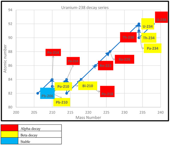 In light of uranium-238, uranium-234’s half-life is 245,500 years, while it takes 164 microseconds for the mass of Po-214 to reduce by half. Products of the natural decay chain of uranium-238 account for over 50% of the global annual dose [19]. 222Rn, a radiogenic radionuclide of the 238U decay series, comprises 55% of the world’s radiation dose [19].