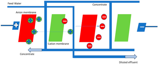 Membrane-based treatment methods have become increasingly important for the removal of radionuclides from drinking water. Ultrafiltration, reverse osmosis, and electrodialysis reversal have emerged as the most widely utilized and effective approaches. Removing radionuclides using membrane treatment involves the application of semipermeable membranes that selectively filter out contaminants, including radionuclides, based on their size, charge, and molecular properties [42]. These membranes act as physical barriers, allowing purified water molecules to pass through while retaining radionuclides and other undesirable substances. Other studies have investigated the efficacy of membrane-based treatment technologies, such as reverse osmosis (RO), ultrafiltration (UF), and electrodialysis reversal (EDR) (Figure 4), for the removal of radionuclides from water sources [42]. A pilot-scale facility was employed to evaluate the performance of these membrane-based methods [42].