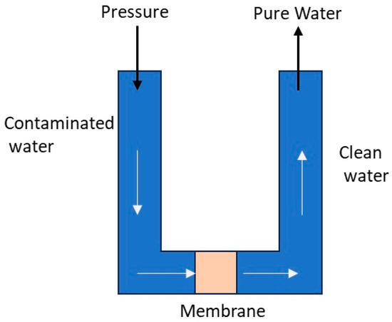 While reverse osmosis (Figure 5) exhibits a high removal efficiency for a wide range of contaminants, it has several drawbacks, such as high capital expenditures, mature infrastructure requirements, and difficulty in downscaling due to the need for high-pressure pumps and robust plumbing, as mentioned by Alkhadra et al. [41]. Addressing the limitations of treating brackish water and dilute feeds using conventional membrane-based technologies requires considering reduced energy requirements and adaptive infrastructure as a viable approach [40,41,42]. Other studies assert that these membrane technologies have demonstrated their feasibility and high efficiency in removing a wide range of contaminants, including perfluoroalkyl substances (PFASs) [43], which are known for their persistence and resistance to traditional water treatment methods. However, the current RO and NF membranes must consistently meet the established guidance limits for PFASs in drinking water. They often face fouling issues that hinder their large-scale application. The authors intimate that novel strategies are being explored to overcome these challenges and comply with the increasingly stringent regulations concerning PFASs in drinking water. One such approach involves using nanocomposite mixed-matrix membranes (MMMs) that utilize advanced materials to revolutionize RO/NF technologies for water purification. Specifically, incorporating metal–organic frameworks as adsorbent fillers within polymeric membrane matrices presents a viable approach for selectively capturing and removing PFASs from water. The use of membrane technology, particularly high-pressure nanofiltration (NF) membrane systems and reverse osmosis (RO), to remove radionuclides from water is relatively limited and not extensively discussed in the literature. This study aims to update the literature on several techniques used in this field [43]. However, it is generally acknowledged that RO/NF membranes can achieve a removal efficiency of at least 95% for radionuclides while improving other relevant water quality parameters. The salt concentration in brine significantly increases during this process, but the overall removal efficiency for salts exceeds 99%. However, it is noted that a drawback of membrane technology is the generation of highly concentrated radioactive wastewater, known as retentate. Retentate is sometimes called the concentrate or the reject from the membrane process, i.e., the portion of the feed solution that is retained or not passed through the membrane. Retentate constitutes approximately 15–25% of the total flow and needs to be disposed of as low-level radioactive waste [43]. Additional variables that should be considered in reverse osmosis (RO)-based systems for radium removal include the necessity of pretreatment and the associated financial implications in terms of both capital and operating expenses. Nonetheless, ongoing advancements in membrane technology are making RO systems more competitive for radionuclide removal applications [43].